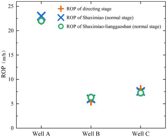 The ROP (Rate of penetration) is used to compare the performance. The drilling tools were lowered into the well and drilled according to conventional drilling methods, and the drilling footage and mechanical drilling speed were recorded during the test. The drilling footage was obtained by measuring the total length of the drilling tools lowered into the well. In addition, the ROP, namely the mechanical drilling speed, could be calculated as the footage per unit of time. Figure 18 gives the ROPs between wells. The first run of the second drilling in Well B is located in the interval of 1998–2623 m at the Shaximiao Formation. The single trip penetration is 625 m. The average ROP in the directing stage was obtained as 5.42 m/h, and the average ROP in the whole well was 6 m/h. Additionally, the first run of the second drilling of Well C is located in the depth range of 2008–2466 m at the Shaximiao Formation, with a single run penetration of 458 m. The average ROP in the Shaximiao formation is 7.54 m/h, and the average ROP of the whole well interval is 8.04 m/h. Comparatively, the first run of the second drilling in Well A is located in the depth range of 1964 m to 2320 m at the Shaximiao–Lianggaoshan Formation. The single run penetration is 356 m. The average ROP was calculated as 22 m/h, and the averaged ROP in Shaximiao Formation is 23 m/h.