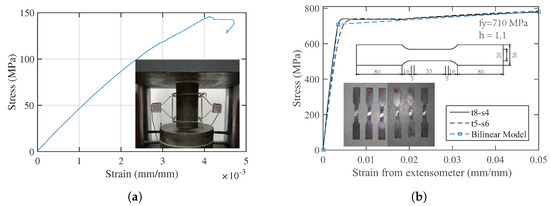 The uniaxial tensile strength of the high-strength steel was verified using coupon specimens with thicknesses of 5 mm and 8 mm and a gauge width of 20 mm. The tests were conducted using a 30-ton universal testing machine (UTM). Detailed dimensions can be found in Figure 1b. Loading for the uniaxial tensile test was applied using a displacement control rate of 2 mm per minute. The failure patterns of six steel coupon specimens with two different thicknesses are shown in Figure 1b. The average modulus of elasticity was 217 GPa from five specimens with a thickness of 8 mm. The corresponding average yielding strength was 693 MPa (based on the 0.2% offset rule), and the ultimate strength was 780 MPa. For the 5 mm thick coupons, the modulus of elasticity, yielding strength, and ultimate strength were 198 GPa, 721.8 MPa, and 801 MPa, respectively. Figure 1b presents a typical stress-and-strain curve obtained from the coupon tests, along with the simplified bilinear model with a hardening parameter h equal to 1.1.