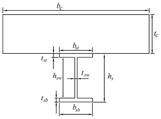 where and are the width and thickness of the top UHPFRC layer; and are the widths of the bottom and top flanges of the steel section; and are the thicknesses of the bottom and top flanges; and and are the height of the web and whole section, respectively. The geometrical parameters of the composite section can be found in Figure 2. and are the modulus of elasticity of steel and concrete, respectively.