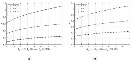 Design plots for : (a) Section I10 with mm; (b) Section I50a with mm.