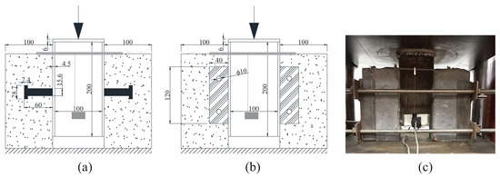 Two types of shear connectors (shear studs and plate connectors) were investigated in this study through small-scale push-out tests. The test setup is shown in Figure 4. The cross-section of the side concrete blocks is 100 mm by 100 mm, and the height is 200 mm. Three specimens were prepared and tested with identical configurations and shear studs of 16 mm. The relative deformation was measured between the bottom of the steel beam and the top concrete surface using a pre-installed string pot. The same test configurations were applied to two push-out specimens with plate connectors. The plate used in the test was 120 mm long and 40 mm wide, with two holes drilled at the middle height. The diameter of the holes was 10 mm, and two No.6 rebars were placed across the holes. The length of the rebar was 120 mm to ensure that part of the rebar extended out of the side block to observe the potential slippage.