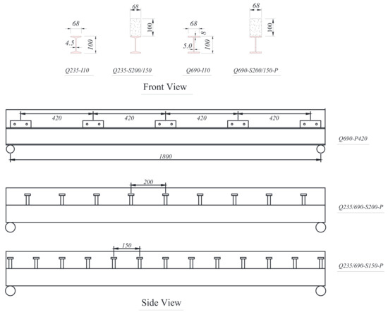 A total of five steel and UHPFRC simply supported composite beams were tested along with two pure steel beams. The details of these beams are summarized in Table 5. Two types of shear connectors were utilized, with specific spacing for each specimen. A designated welding machine was used to ensure the quality of the stud welding, as shown in Figure 5, and steel plates with holes were welded to the steel beam. A schematic drawing of the various specimens can be found in Figure 6.