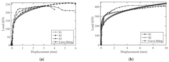 Several numerical models were proposed to quantify the relation between the shear force and slippage, among which the concrete design model code [33] provided the most straightforward equation, as shown in Equation (12). Based on the experimental results, the parameters were calibrated for both types of shear connectors, and the corresponding curves are shown along with the experimental results in Figure 8. 240 kN and 3 mm were adopted for the peak shear force and corresponding deformation, respectively, for stud connections, whereas kN and mm were adopted for the plate connectors.