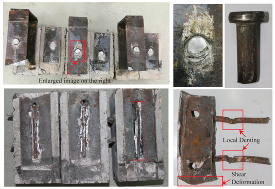 The load-versus-displacement curves of the two specimens with plate connections are shown in Figure 8b. The plate connectors provided higher shear resistance at larger deformations exceeding 10 mm. After testing, the concrete block was crushed sideways in order to observe the deformation of the shear connectors. Plastic shear deformation of the steel plate, as well as the local denting of the crossing rebars, were observed, as shown in Figure 9.