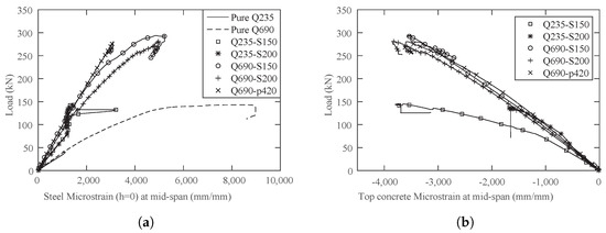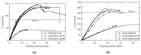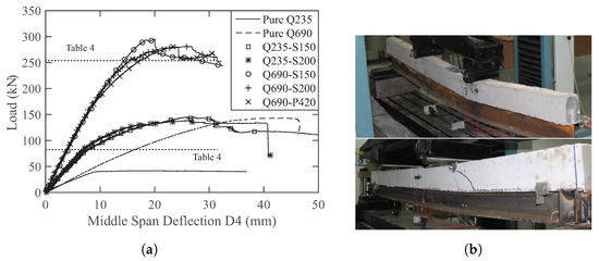 The load-versus-displacement curves from the experiment and finite element analyses are shown in Figure 16a,b for normal- and high-strength steel beams, respectively. The structural responses of pure steel beams were also obtained experimentally and numerically. These two responses aligned well with the FEM results in slightly overestimating the stiffness of the high-strength steel beam. Regarding the predictions of the flexural behavior of the composite beam, the load–deflection curves from the FEM captured the stiffness and ultimate strength for specimens Q235-S150/200. Although the difference between the two specimens was not as obvious in the FEM results as it was in the experimental results, the finite element model underestimated the initial stiffness of specimens Q690-S150/200, whereas the peak flexural loading was close to the experimental results. The difference in the initial stiffness can be attributed to the small friction that existed in the supports.