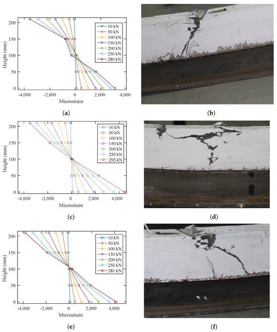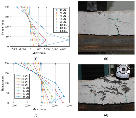 The three specimens with high-strength steel beams exhibited much higher ultimate flexural load capacities, as shown in Figure 10a. All three types of connections initially provided sufficient bonds and led to similar elastic stiffnesses, whereas the final failure modes were slightly different. The specimen with stud connectors at a spacing of 150 mm reached the highest ultimate load at 295 kN and failed due to the crushing of UHPFRC, as shown in Figure 13d. The crushing of concrete material was initiated at the exterior surface and extended into the lower layers. The steel section was all in tension during the whole loading history, as shown in Figure 13c. The specimen with larger stud spacing, at 200 mm, failed slightly differently, as shown in Figure 13f. Diagonal shear cracks appeared and widened before the concrete was crushed on the top. Generally speaking, the specimens with stud connectors exhibited less severe softening during nonlinear loading compared to the specimens with plate connectors, as shown in Figure 10a. Specimen Q690-P420 failed due to shear cracks and concrete crushing, as shown in Figure 13b. Relative slippage can be seen in the strain profile plot in Figure 13a, which led to the degradation of stiffness and softening, as shown in Figure 10a.