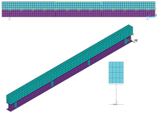 Finite element analyses were performed using Ansys® software. The geometries, meshes, and boundary conditions are shown in Figure 14 for the two composite beam models under positive and negative bending scenarios. Eight-node solid elements were used for modeling the concrete part, whereas four-node shell elements were used for the steel beam. Combin39 elements were used, as shown in Figure 15b, to simulate the shear connection between concrete and steel, which can incorporate the load-versus-deformation relation obtained from the push-out tests. The different spacings of the shear connectors were taken into account, as shown in Figure 14, with a spacing of 150 mm for the model on the top and 200 mm for the model on the bottom.