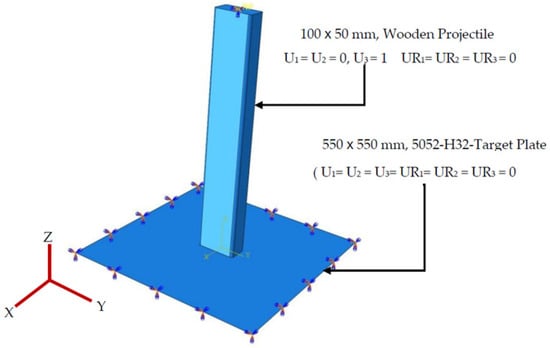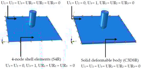 The load was applied to the reference point of the projectile in terms of velocity as a predefined field. Fixed boundary conditions were used for the target plate, which means translational displacements and rotations of the plate were restrained in all directions (U1= U2 = U3= UR1 = UR2 = UR3 = 0). In the case of the projectile, its translational displacements were restricted in all directions except the direction of the velocity (U1 = U2 = 0, U3 = 1), while the rotations were restrained in all directions (UR1 = UR2 = UR3 = 0).