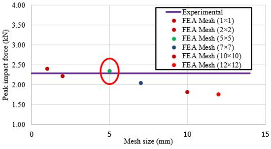 The appropriate use of the element size is important in finite element analysis (FEA) to effectively simulate the deflection-time history and force–time history of aluminum panels. Thus, a convergence study was considered in the finite element modeling of the aluminum plates. A plateau was noted between 2 mm and 5 mm mesh size with a percentage difference of around 1%. The mesh size 5 × 5 mm (both for the projectile and the plate) was found to be the most suitable for the finite element modeling of the proposed model (refer to Figure 3).