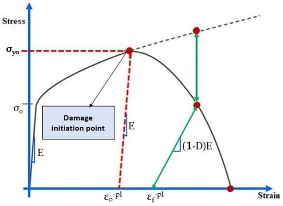 The plastic behavior of aluminum is best defined using the piecewise linear plasticity material model to the point where the plate has not experienced bulging. But when fracturing is expected (at critical strain), it is important to define the damage initiation. ABAQUS [21] offers a variety of choices of damage initiation criteria for ductile metals, each associated with distinct types of material failures. The damage evolution in ABAQUS [21] is defined by using the values of the fracture strain. The fracture strain is the point where damage initiates. In Figure 4, σyo and εf−pl are the yield stress and equivalent plastic strain at the onset of damage. εo−pl is the equivalent plastic strain at failure.