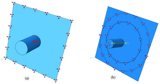 The surface-to-surface interaction with penalty contact was employed in the proposed model. The definition of the master and slave surfaces is arbitrary; however, in general, the master surface is defined as the stiffer body or the surface with a coarser mesh if the two surfaces have comparable stiffness [29]. In the proposed model, the mesh of the projectile and the target was of the same size, which is why the projectile (a stiffer surface) was defined as the master and the target plate as the slave surface.
