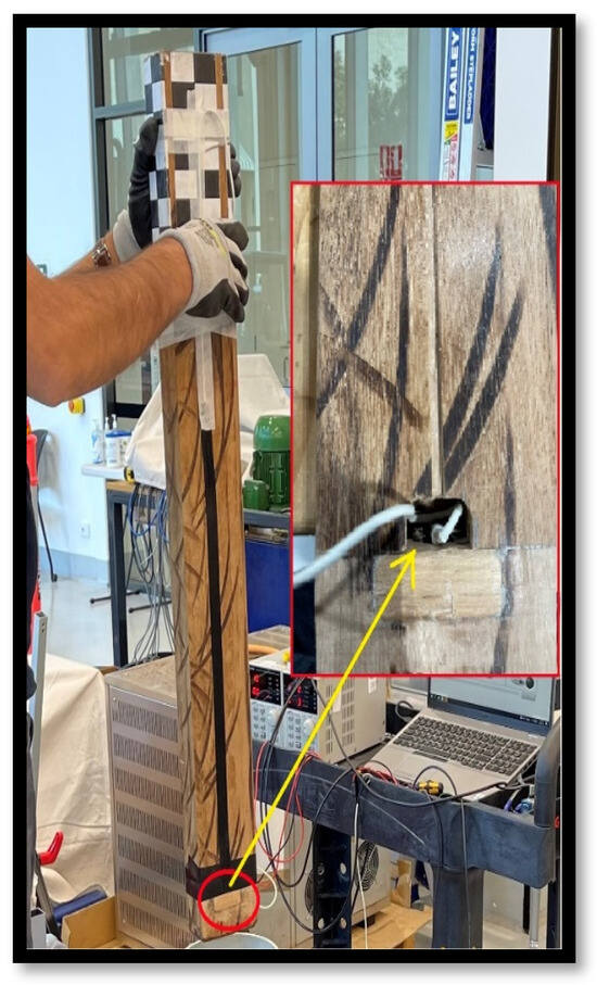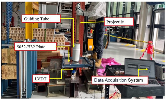 A laser displacement sensor HG-C 100 was placed underneath the plate and was aligned along the vertical axis of motion of the projectile to record the readings for the deflection–time histories of the specimen for the impact test. HG-C1100 has a measurement range of ±35 mm, a sample rate of 26 K/s, and a measurement center distance of 100 mm. To record the acceleration of the projectile during the event, an accelerometer 7264D-2KTZ-2-360 ± 2000 g (a resonance frequency range of 40 kHz) was connected to the projectile at 50 mm from the impacting edge. The accelerometer was screwed inside the timber perpendicular to the direction of the drop as shown in Figure 9. It was used to record the acceleration–time history that was then employed to calculate the impact force–time history. The impact velocity of the projectile was determined using Equation (6).