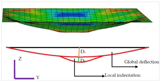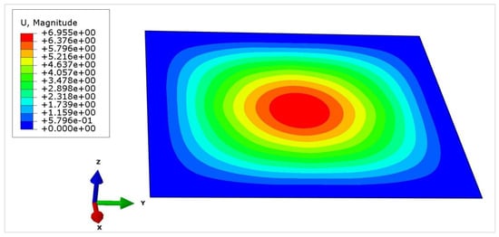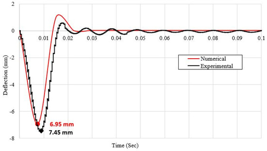 The response of the panels was recorded in terms of the impact force–time history and deflection–time history. The results showed that the impact force–time history had four phases: an initial peak phase, a vibration phase, a plateau phase, and an unloading phase. The first three stages are the parts of the impact process’s contact stage, whereas the last phase occurs during the separation stage. The impact force increases rapidly at first, reaching its peak as the strike begins, followed by following spikes of lesser amplitudes. The plate and impact head then move together and remain in contact, indicating the plateau period. This plateau period is followed by the unloading phase, in which the impact force is reduced to zero when the panel and impact head are entirely separate. The primary peak force recorded was 20.13 kN (see Figure 10). The value of the maximum central deflection recorded was 7.45 mm (see Figure 11). The comparison of the experimental and numerical results showed the percentage difference between the peak impact force recorded in the experiment and that predicted using the proposed model had a difference of less than 5%. Similarly, the difference in the value of the maximum displacement predicted using the base model and that recorded in the experiment was approximately 9%. The comparison of the experimental and numerical results for the force–time history and deflection–time history are given in Figure 10 and Figure 11, respectively. Figure 12 shows the numerical results for the maximum deflection at the center of the plate. Post-test observations of the impacted plate indicated no local indentations (see Figure 13), which is consistent with the predictions provided by the numerical model, showing zero residual deflection (see Figure 11).