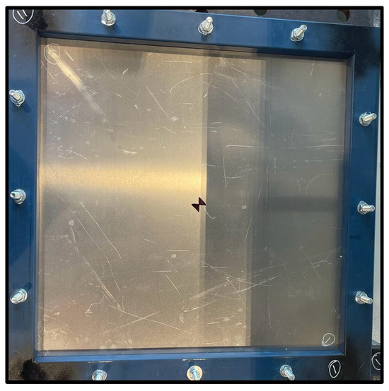 The test setup consisted of a drop pipe to guide the projectile to hit the plate at the center. The test specimen was made up of a 3 mm thick aluminum plate of alloy 5052-H32 with a size of 550 mm × 550 mm that was held by a supporting frame using M10 bolts (see Figure 8). The unsupported area of the specimen was 500 mm × 500 mm. The AS/NZ 1170.2_2021 instructions were followed for the selection of the timber projectile. It states that where windborne debris is required for impact resistance testing, the debris loading shall be “a timber member of 4 kg mass (minimum density of 600 Kg/m3) with a nominal cross-section of 100 mm × 50 mm at the impacting end” [30]. The projectile was dropped with a velocity of 2.8 m/s from a height of 400 mm.