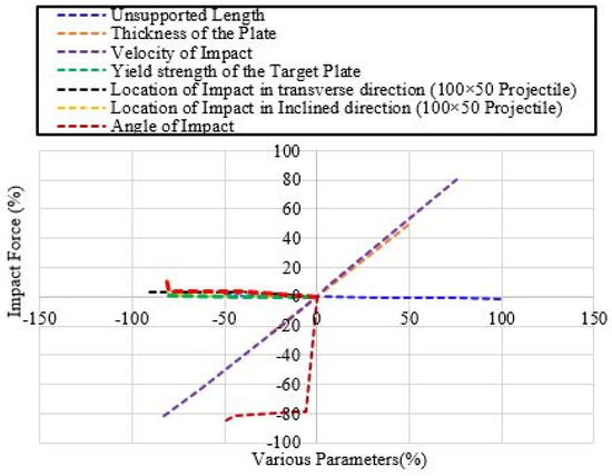 where Fi is the value of the impact force to be predicted, Fα0 (64.74 kN), Fβ0 (14.04 kN), and Fγ0 (11.80 kN) are the impact forces recorded when the projectile hits the center of the plate at an angle of 90°, 85°, and 45°, respectively, at reference parametric values (refer to Table 15). Furthermore, t represents the thickness of the plate, v stands for velocity of impact, r is the distance of impact from the center of the plate, Fby is the yield strength of the alloy used in the manufacturing of the plate and L is the unsupported length.