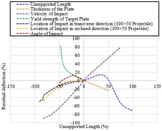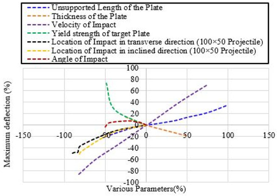 where Δmi is the maximum deflection that is to be predicted, Δmα0 (11.72 mm), Δmβ0 (11.73 mm), and Δmγ0 (10.89 mm) are the maximum deflections recorded when the projectile hits the center of the plate at an angle of 90°, 85°, and 45°, respectively, at the reference parametric values (refer to Table 15).