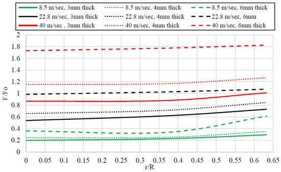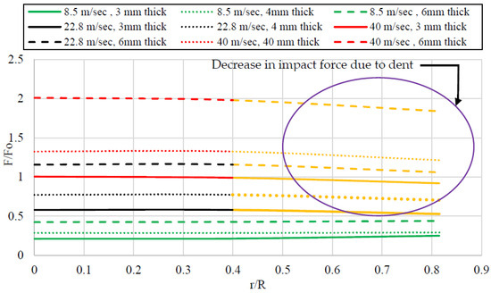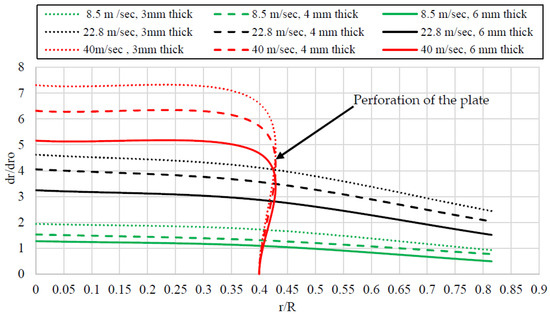 When the results of the maximum and residual deflection for a base model were analyzed, around a 55% reduction in the maximum deflection (see Figure 16 and Figure 21) and a 51% reduction in the residual deflection (see Figure 17) were noted at location Q when compared with the respective values at the center of the plate. It is worth mentioning that the plate perforated at location Q at higher velocities. As shown in Figure 22, when the ratio of r/R increased, a decrease in the residual deflection was recorded at 8.5 m/s and 22.8 m/s; however, a perforation was noted at the velocity of 40 m/s where the value of the residual deflection was noted as zero and the curve went down to touch the zero line. In Figure 21, dmo represents the referenced maximum deflection of the plate where the impact is at the center of the plate, whereas the dm shows the maximum deflection when the location of impact is other than the center. Similarly, in Figure 22, dro represents the referenced residual deflection of the plate where the impact is at the center of the plate, whereas the dr shows the residual deflection when the location of impact is other than the center.