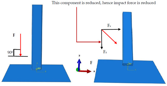 The projectile’s incident angle significantly influences the impact force and the maximum and residual deflection in the targeted plate [38]. The sensitivity analysis showed that the maximum impact force results when the projectile hits the target normally at 90°. When the angle of impact was reduced by 50%, i.e., from 90° to 45°, the impact force was reduced by approximately 84.5% (see Figure 15). This is because when the impact is at an angle, the force is resolved into horizontal and vertical components, causing a reduction in the impact force (see Figure 23). As Equation (11) suggested, the geometry (dimensions) of the projectile hitting the plate has a significant influence on the contact stiffness Ke, which ultimately affects the impact force. When the impact is at an angle, the area of contact stiffness between the projectile and the target plate is reduced, which results in reducing the impact force.