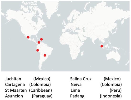 During 2018–2021, we collected all street view images in eight cities in both Latin America and Asia (as shown in Figure 2) using a 360 camera mounted on a ground vehicle. As illustrated in Figure 1, the vehicle drives through the streets with the cameras taking images at a constant speed, resulting in spaces of 5–10 m between two images. The GPS coordinates and camera parameters are recorded for each image at the moment the image was taken. The images selected for this research are those perpendicular to the travel direction.