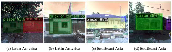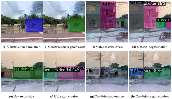 A few prediction examples are presented in Figure 3, which shows the segmentation results compared with ground truth annotations. Figure 3a,c,e,g are the original images annotated by humans. Correspondingly, Figure 3b,d,f,h are the same images segmented by the model. In these examples, the model can accurately predict the construction type, material, use, and condition. It should be noted that these images are collected from different locations in the world: Latin America and Southeast Asia. These two regions share similar geographical and social–economic characteristics. To demonstrate this, we show in Figure 4 some examples of street view images collected from these two regions.