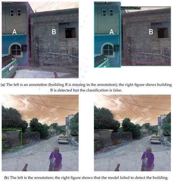 Examples of false predictions (a) Left is annotation (building B is missing in the annotation); right figure shows building B is detected but the classification is false. (b) Left is annotation; right figure shows that the model failed to detect the building.