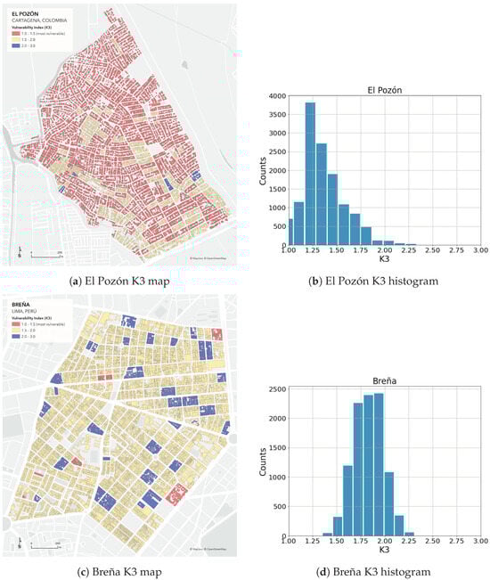 To explore the relationship between the visual inference of housing characteristics and the socio-economic status of those living in them, two neighborhoods were viewed with distinct qualities. The first is El Pozón (2.4 sq km), an informally established neighborhood of low-income residents living on the periphery of Cartagena, Colombia. In contrast, the second is Breña, a densely-populated neighborhood near the historical city center of Lima, Peru. Breña (3.2 sq km) is a middle- to low-income neighborhood that was formally established in the mid-twentieth century. Their K3 map and the histogram are plotted in Figure 7. From the figures, we can see most households in El Pozón have a K3 value less than 1.5 (more vulnerable), while most households in Breña are greater than 1.5 (less vulnerable). This means our K3 index is capable of capturing the distinctions between households.