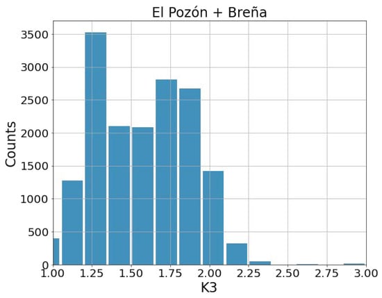 K3 distributions: (a) El Pozón K3 map; (b) El Pozón K3 histogram; (c) Breña K3 map; (d) Breña K3 histogram.