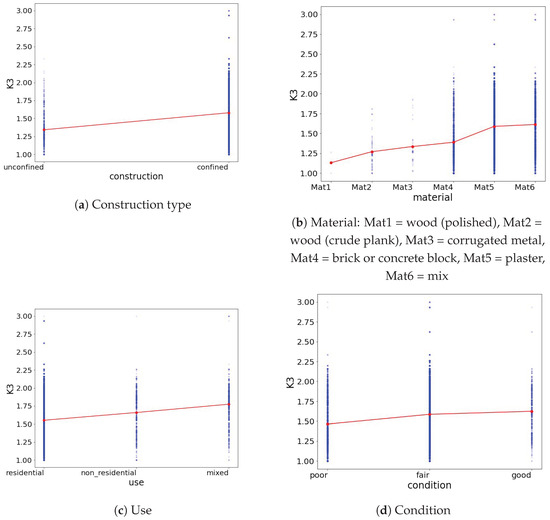 Predictions versus K3 Index: (a) construction type; (b) material: Mat1 = wood (polished), Mat2 = wood (crude plank), Mat3 = corrugated metal, Mat4 = brick or concrete block, Mat5 = plaster, Mat6 = mix; (c) use; (d) condition.