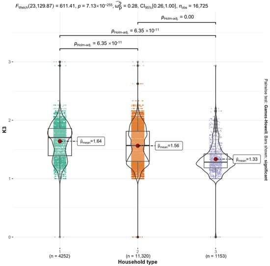 To further compare the household vulnerability of the three household types, we drew a boxplot and ran a Welch’s ANOVA test, as illustrated in Figure 11. The p-value of the ANOVA test is less than 0.01 (, ), which indicates there are significant differences between the three household types in terms of their K3 value. The average K3 values of type 1, 2, and 3 are 1.64, 1.56, and 1.33, respectively, and they are significantly different from each other (p-value less than 0.01 for each pair in Figure 11). This means type 1 households are the least vulnerable, while type 3 households are the most vulnerable. The results demonstrated the potential for predicting household vulnerability based on visual building attributes, as the visually unconfined and poor-conditioned type 3 households have a lower average K3 value, thus are more vulnerable, and the mixed-use and mixed-material-made type 2 households have a higher average K3 value, thus are less vulnerable.