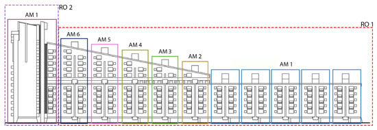 The building selected for in-depth analyses is composed of two residential organisms: RO1—the bar and RO2—the tower. The bar relies on 11 Aggregative Modules: the first five (AM1) consist of the repetition of five identical residential floors (ETM1) with two apartments per floor (APA 1 and APA 2); from AM2 to AM6 various combinations are proposed to manage the increasing building outline and the presence of an open cellar floor on the sixth level (