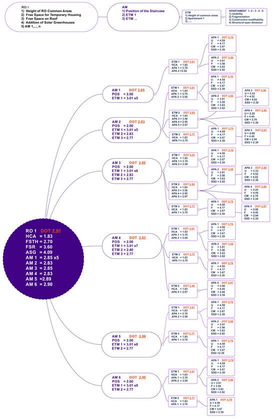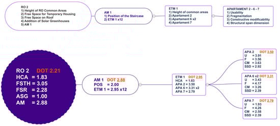 The main discrepancies between RO1 and RO2 lie in indicators’ evaluations at the Residential Organism level (mainly for FSR and ASG indicators). The great availability of free space on the roof, which is usually proper for bar buildings when compared to towers, underlines the readiness of RO1 for the application of environmental and sustainable solutions such as green roofs, the collection of rainwater for phytoremediation processes, and the installation of photovoltaics or thermal panels. In the bar building, the available surface for transformation on roofs reaches around 10,000 m2 (10% of the residential surface of all the dwellings) while for the tower it is around 130 m2 (4% of the residential surface). The value of the FSR indicator is 3.60 and 2.28 for RO1 and RO2, respectively. The N–S exposition of the bar building leads to 50% of the loggias looking southwards. These can be easily transformed into greenhouses, leading to a high ASG score, equal to 4.09. Conversely, for the tower, no loggias have the effective orientation to be transformed into a solar greenhouse, leading to an ASR score of 1.00. The tower shows a higher score compared to the bar regarding the FSTH indicator (equal to 2.70 and 3.05 for RO1 and RO2, respectively), related to the availability of space for temporary housing. The presence in the tower of several levels of cellars, starting from level +10, that can be easily changed into dwellings, increases the transformable surface up to 24% of the residential one while in the bar building, the few cellars located exclusively at level +6 reduce such incidence to less than 20%.