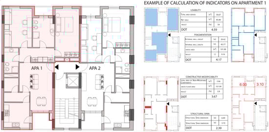 Figure 8. The apartment shows higher transformability scores in terms of Usability (U) and Fragmentation (F) indicators, equal to 4.59 and 4.17, respectively. The U-score underlines the great incidence of distribution spaces, thus meaning the higher freedom of intervention when layout reorganizations are considered. The F-score highlights the scarce incidence of internal partitions and therefore a reduced cost for demolition/reconstruction works, instead. The results for these indicators are higher than those published in [