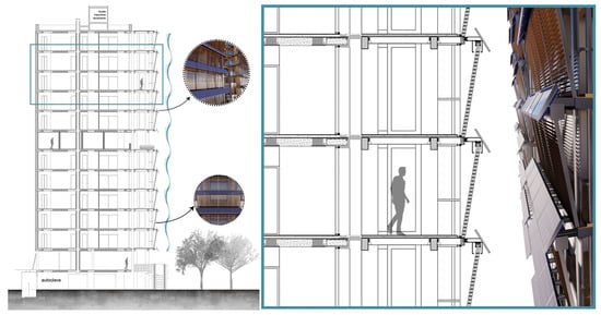 The main solution, namely the installation of solar greenhouses, is chosen considering the ASG indicator (4.09), which compares the number of loggias and balconies on the south side of the building that can be easily and efficiently transformed into solar greenhouses, to the overall number of loggias and balconies. A bioclimatic greenhouse performs precise functions depending on the season and the period of year. During the winter season, it exploits the sun’s rays, converting them into thermal energy to be stored inside and transmitted to the rest of the dwelling. However, during the night the dispersions of heat to the outside should be minimized. At the same time, it ensures defense from the vertical sun radiation in summer, even allowing, when well-designed, natural ventilation inside the house. The openings must be strategically located to ensure effective air circulation. The main objective of a bioclimatic greenhouse is to effectively contribute to the energy saving of the whole house, keeping it warm in winter and cool in summer. Based on these assumptions and starting from the position of existing loggias on the south façade of the building, a self-standing structure in wood and steel hosts the new solar greenhouses, as shown in