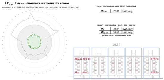 2y. This value accounts for both the energy demand and the efficiency of the heating system. For the heating system, a centralized gas boiler was designed for the entire portion of the building, while each apartment was equipped with an electric heater for hot water. In terms of energy demands, the mean energy performance index useful for heating (EP