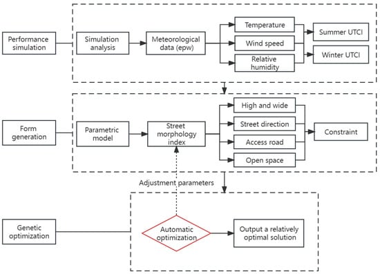 In recent years, many works have begun to use simulation tools such as Envi-met (.ENVI-met website) [6] Phoenics (2019 v1.0) [7], and Fluent (6.3) [8] and the rapid development of computer simulation technology to conduct quantitative studies on the wind-heat environment. However, the mentioned software has certain deficiencies. In terms of methodology, the software approach is basically to analyze single variables one by one and then manually couple them. It is impossible to obtain the precise value of each variable, and it is inconvenient to connect with the data in modeling and optimization software. The mentioned simulation software cannot simulate the model of dynamic changes in shape. Therefore, the parametric platform mainly based on Grasshopper (GH) has been gradually introduced into the simulation of urban microclimate. This method combines computer modeling, parametric design, performance simulation, and an optimization algorithm to carry out automatic optimization and program iteration. It can avoid the disadvantages of excessive adjustment times and the low efficiency of traditional simulation optimization methods.