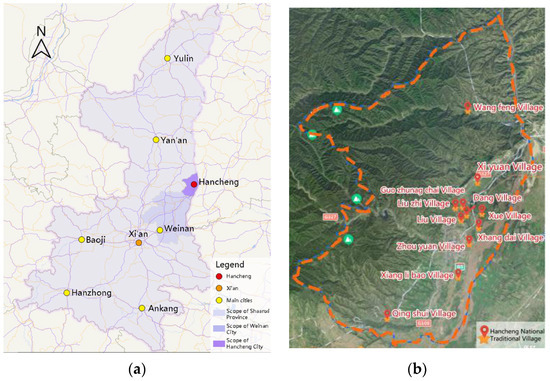 There are a total of 11 traditional villages in Hancheng that have been included in the list of traditional villages in China, with a quantity and distribution far exceeding the national level. The spatial distribution and scope are shown in Figure 2b. Most of these traditional villages were built during the Ming and Qing dynasties, during which they preserved ancient buildings with different styles.
