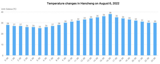 We draw the temperature of the day based on meteorological data from the meteorological station (see Figure 3). When the weather temperature is 26–38 °C, it will be sunny to cloudy, with south winds and wind speeds of 1–2 levels [15].