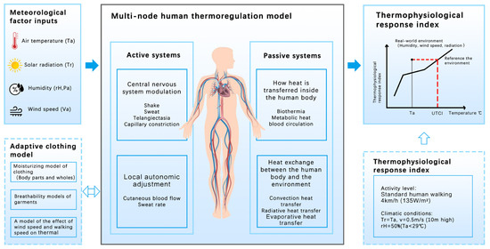 The Universal Thermal Climate Index (UTCI) is defined as the temperature at which the human body exhibits the same physiological response as it would in the actual environment, but under specified reference conditions. The Universal Thermal Climate Index (UTCI) calculation model [16] is shown in the following Figure 5: