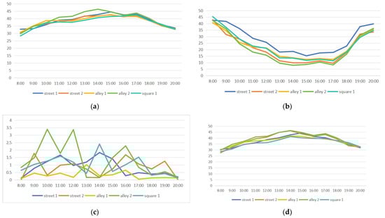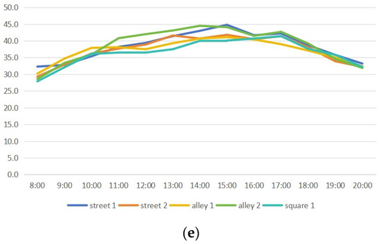 Figure 6d shows the temperature changes of the black globe at different measurement points from 8:00 to 20:00 on that day. It can be seen from the figure that the black-globe temperature in the two small alleyway measurement points is higher, while the temperature at the square is lower.