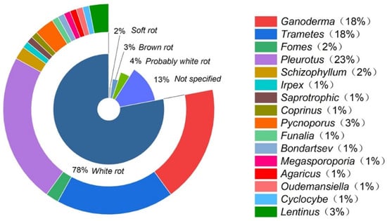 There are four main types of fungal species that can be used in the manufacturing of mycelium composites: white rot, soft rot, or brown rot as shown in Figure 1. Comparison of the growth conditions of these fungi revealed that brown rot fungi predominantly degrade cellulose, leaving behind a residue rich in lignin [28]. White rot fungi, on the other hand, have the ability to break down both lignin and cellulose in wood [28]. Soft rot fungi secrete cellulase in order to enzymatically break down cellulose in woody tissues [29], while the specific decay characteristics of the other listed species are unknown.