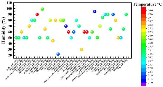 In the context of humidity, optimal cultivation conditions for white rot fungi such as Trametes versicolor employed in the fabrication of mycelium composites generally encompass a range spanning from 70% to 80% [39]. However, brown rot fungi exhibit optimal growth within humidity parameters of above 95% [40]. Conversely, the growth rate of soft rot and other fungi is the fastest when the relative humidity is from 60% to 75% [41]. Mycelium growth requires a humid environment. The humidity level required for mycelium growth varies based on the type of fungus utilised. Figure 2 provides a summary of the various temperature and humidity ranges employed in different projects for the cultivation of mycelium-bound composites (MBCs). According to Figure 2, most mycelium species can grow within relative humidity (RH) levels ranging from 40% to 90%. Different fungi might have various optimal humidity values for growth and colonisation within this range. For example, Trametes versicolor is the form of fungus utilised in the development of mycelium-bound composites. According to Figure 2, this fungus grows well in a rather high humidity range of 70–90%. Nonetheless, following this phase of development, the samples must be desiccated to cease further growth and ensure uniform properties [21].
