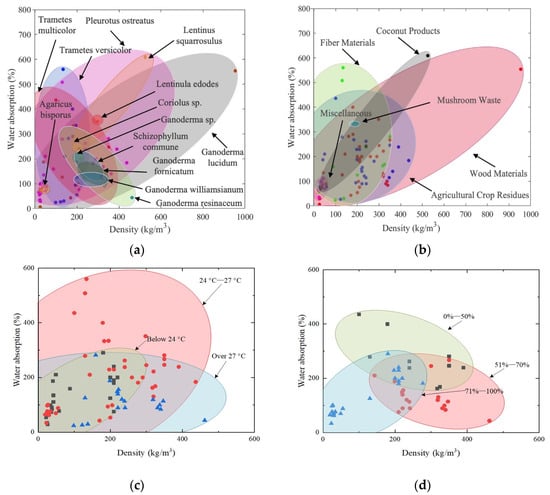 The density and water absorption of different (a) fungal species, (b) substrates, (c) temperature, and (d) humidity.