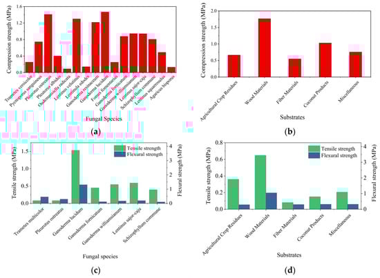 The average values of mechanical property of MBCs: (a) average compressive strength values of different fungal species, (b) average compressive strength values of different substrates, (c) average flexural strength and tensile strength values of different fungal species, (d) average flexural strength and tensile strength values of different substrates.