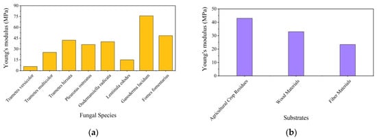 The diverse range of Young’s modulus values exhibited by mycelium-bound composites (MBCs) across various fungal species and substrates underscores the nuanced influence of formulation and testing conditions on their mechanical properties. The reported values for MBCs (Figure 5) have shown that the average Young’s modulus values of different fungal species range from 6 Mpa to 77 Mpa, and the substrate range from 23 Mpa to 43 Mpa. The MBCs grown on agricultural crop residues substrates by Ganoderma lucidum were found to have the highest Young’s modulus value and hence, had better mechanical strength and stiffness. However, it is crucial to note that Young’s modulus can be significantly impacted by external factors like humidity and temperature, which contribute to the observed variability. For more information, the mechanical properties of MBCs with different fungal species and substrates are shown in Appendix B.