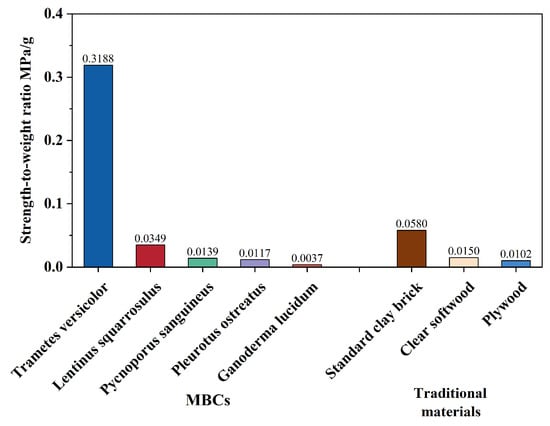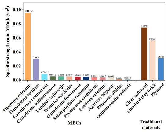 Specific strength ratio values were determined for various fungal species of MBCs and traditional materials in Figure 6. Fungal species like Pleurotus ostreatus exhibit specific strength ratios spanning a wide range. Pleurotus ostreatus shows a high strength-to-density ratio of 0.0958 MPa/(kg/m3). This makes it a promising candidate for applications demanding high strength-to-density requirements. Ganoderma lucidum and Oudemansiella radicata, on the other hand, demonstrate relatively lower specific strength ratios. This suggests that these species may have limitations in delivering strength in proportion to their density. Compared with other traditional materials, the specific strength ratio of Pleurotus ostreatus is higher than the specific strength ratio of clear softwood, standard clay brick, and plywood. This means that using Pleurotus ostreatus to grow MBCs may be a potential alternative to traditional construction materials in civil engineering.