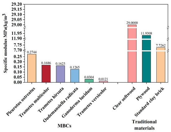 The specific modulus values of several fungal species and traditional materials are presented in Figure 8. Pleurotus ostreatus and Trametes multicolor emerge as prominent species in this aspect. Pleurotus ostreatus, with a maximum specific modulus value of 0.2744 MPa/(kg/m3), would be suitable for applications demanding high rigidity and stability. Trametes multicolor also displays reasonable specific modulus values, although slightly lower than Pleurotus ostreatus. The specific modulus of Trametes versicolor and Ganoderma lucidum are 0.0121 MPa/(kg/m3) and 0.0304 MPa/(kg/m3), respectively. These are some of the lowest values observed among the fungal species studied. However, compared with traditional materials, the currently studied of MBCs still provide no substitute for these three traditional materials based on specific modulus. Further research is still needed to find potentially high specific modulus MBCs to replace traditional materials.