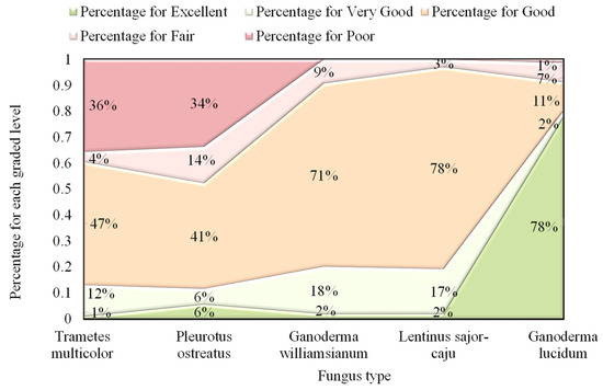 The FCE (fuzzy comprehensive evaluation) method was used to establish a systematic ranking system for the selection of mycelium composites as secondary structural members in façade construction. The evaluative variables or factors (U) included density, water absorption, tensile strength, flexural strength, and manufacturing periods. Each criterion was assigned assessment levels (V) on a predetermined scale, ranging from outstanding to poor. Appendix C provides information about the specific ranking criteria and their corresponding evaluation levels. By integrating both mechanical properties and manufacturing time into the material selection process, architects and designers can make well-informed decisions for their projects, achieving the optimal balance between performance and time. Trametes multicolor, Pleurotus ostreatus, Ganoderma williamsianum, Lentinus sajor-caju, and Schizophyllum commune mycelium composites were investigated for their potential application as façade construction materials. Based on the findings shown in Figure 9, Pleurotus ostreatus emerged as the most promising fungus for the production of mycelium composites used in façades, achieving a reasonable balance between material performance and production time. In this investigation, however, the range for each variable is unknown due to the lack of available data. Future research can enhance the robustness of these findings by increasing the sample size.