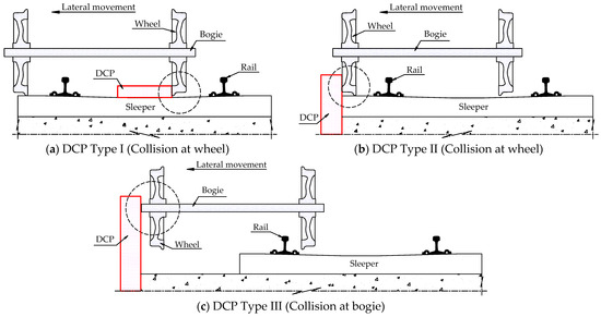 In contrast to the research on enhancing safety systems for individual trains, studies on developing rerouting auxiliary systems for railways in derailments are still scarce. This approach proves beneficial in improving the operational safety of large-scale railway upgrades. Nevertheless, designing an entirely new preventive system to ensure the safety of train operations is likely to be expensive and impractical in the short term, given that many countries worldwide already possess extensive rail networks, with a substantial portion being HSR [24,25,26,27]. Consequently, developing auxiliary systems for derailment-prone areas, with the capability of seamlessly integrating them into existing rail infrastructure, becomes even more urgently needed and highly feasible [28]. Recently, derailment containment provisions (DCPs) have emerged as a potential solution for HSR to reduce the consequences by redirecting and maintaining derailed trains near the track centerline. Figure 1 illustrates three commonly used concepts of DCPs in railways, namely DCP Type I, II, and III [29]. DCP Type I is positioned within the track gauge and directly interacts with the wheels during derailments, thereby functioning as guard rails [30,31,32]. Although DCP Type II has a function similar to its counterpart, Type I, it is positioned outside the tracks. DCP Type III is outside the track gauge but is prepared to absorb impact from axles or bogies rather than the wheels. In Korea, DCP Type III is mandated on railway bridges with train speeds exceeding 200 km/h to prevent collisions with the superstructure or falls from the bridge in a derailment [33].