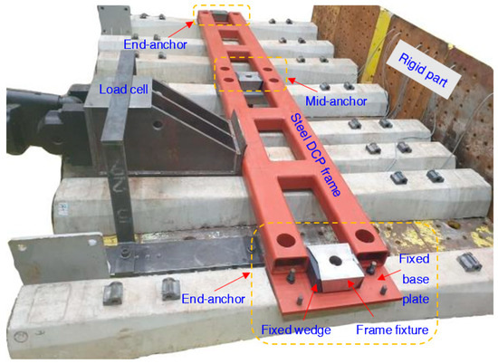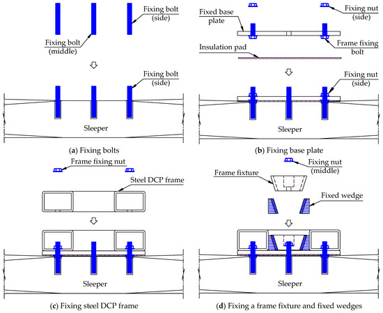 Each module of the DCP served the purpose of averting the derailing of a cluster consisting of seven sleepers. The DCP was attached to the sleepers at three positions: the middle anchor and two anchors at both ends. First, for each anchor position, epoxy resin was employed to secure bolts with a 20 mm diameter to the sleepers, each having an anchor length of 90 mm. Next, the sleeper was attached to a fixed base plate and insulation pad using two side fixing nuts. Subsequently, the steel DCP frame was attached to each base plate with four corner bolts. Finally, a frame fixture and fixed wedges were employed to firmly fasten the DCP frame, base plate, and sleeper in place, as shown in Figure 4.