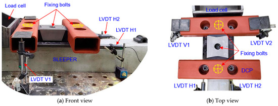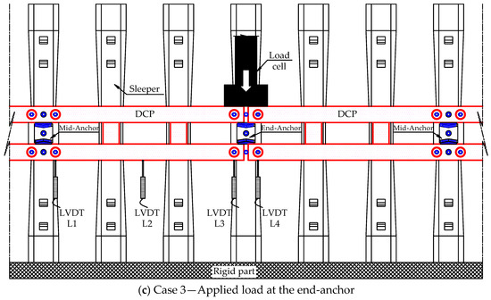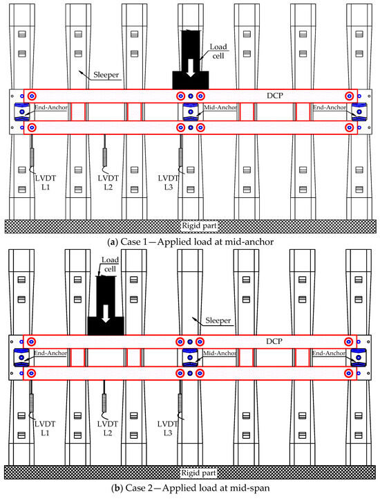 Figure 6 shows the general view of the steel DCP system used in the experimental test, providing a brief overview of its components and design. We divided the steel DCPs into three groups, each designated for quasi-static load testing at different locations: the mid-anchor (referred to as Case 1), the mid-span (Case 2), and the end-anchor (Case 3). We positioned the LVDTs using the load location scenarios corresponding to specific configurations. For Cases 1 and 2, LVDTs L1, L2, and L3 were placed at the end-anchor, mid-span, and mid-anchor, as shown in Figure 7a,b. In Case 3, LVDTs L1 and L2 were placed at the mid-anchor and mid-span, respectively, while LVDTs L3 and L4 were situated on both sides of the end-anchor, as depicted in Figure 7c. In addition, the rigid part employed to secure sleepers serves a role analogous to that of steel rails in a railway system. Each case was repeated twice, with the first and second tests indicated by the suffixes “−1” and “−2”, respectively. The sleepers were firmly attached to the rigid part and considered to experience negligible deformation under the effect of load. The testing procedure and equipment specifications for LVDTs and UTM are similar to those used in single anchor tests. The target load was expected to be equal to or higher than the design load (165.6 kN), with a recommended margin exceeding 125%.